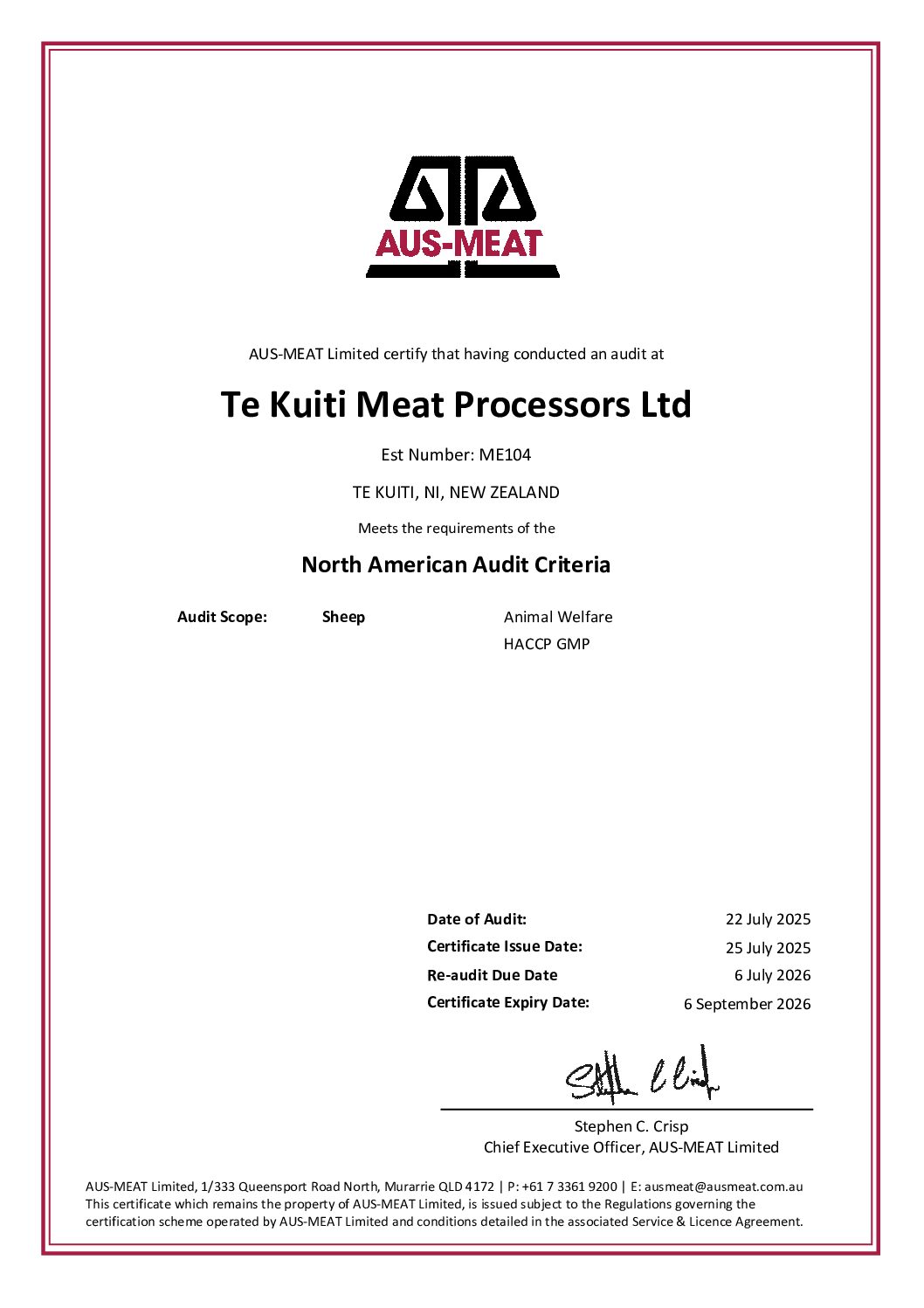 Te Kuiti Meat Processors Limited is committed to supplying a wide range of lamb products to discerning customers and consumers around the globe under 52 week supply programmes.